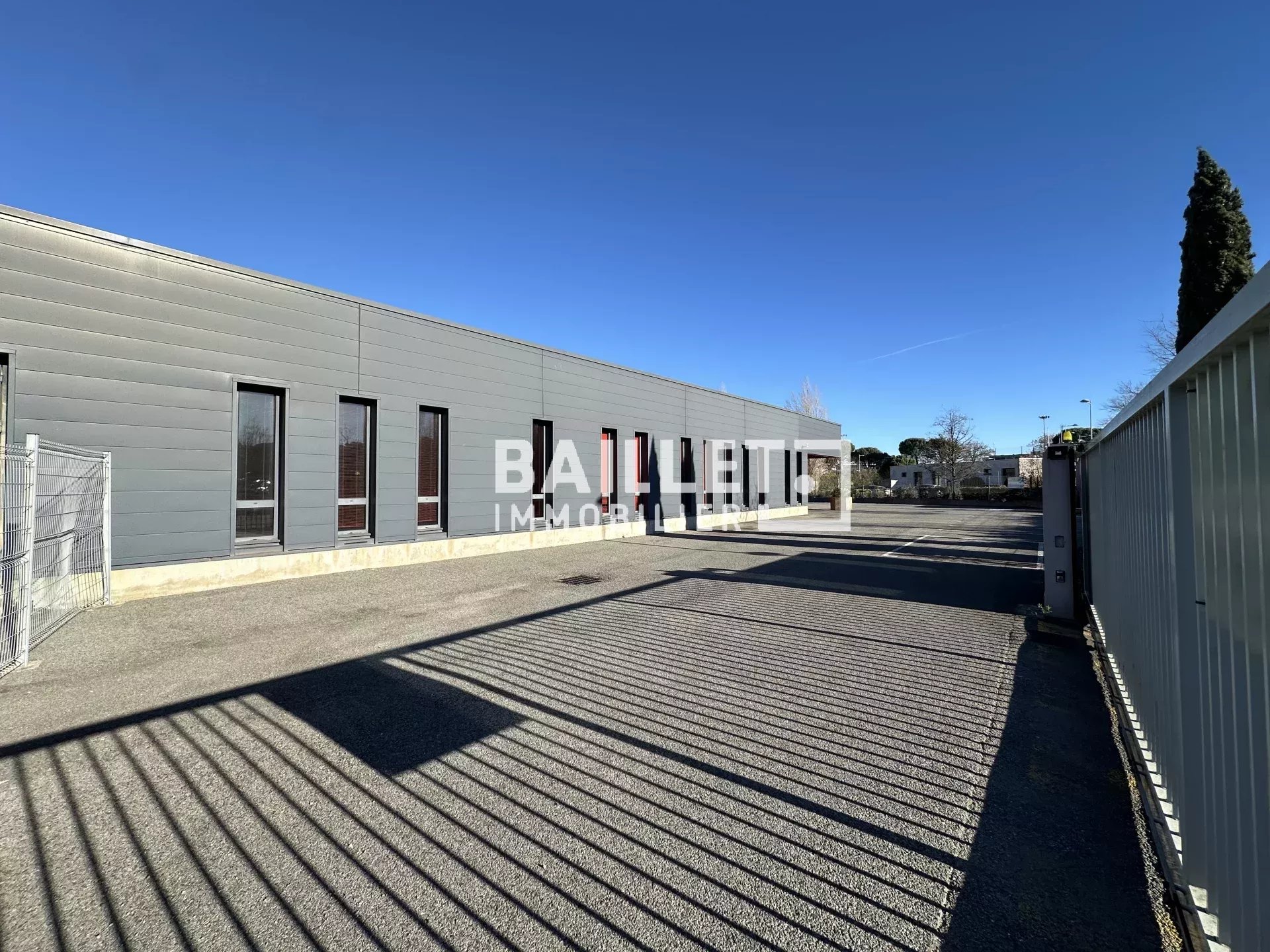 Construit sur une parcelle de 4 600 m², l'ensemble bénéficie de 36 places de parking et deux portails coulissants de 8,50 m à chaque extrémité du bâtiment.